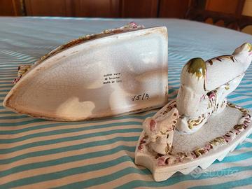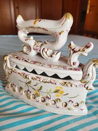 Ferro da stiro. In ceramica, decorato , ispirato stile manifattura Capo di Monte. Esempio di oggettistica d'epoca da collezione