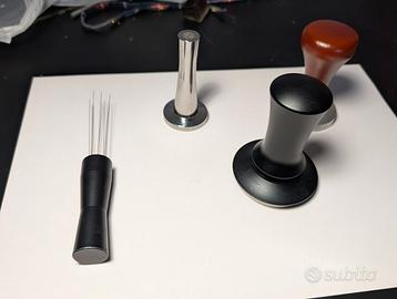 I filtri sono stati usati meno di 10 volte. I pressini sono come nuovi. Il pressino da 54mm è un po' leggero e non di alta fattura. Quello da 58 è di ottima qualità, pesante, regolabile e scorre bene. Il pressino da 41mm è interamente in metallo e specifico per il basket La Marzocco Single shot.