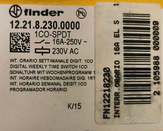 FINDER 12.21.8.230.0000 Finder è un interruttore con timer settimanale digitale elettronico. Impostazione di intervallo di tempo minimo di 1 minuto e batteria interna per l'avvio senza alimentazione.
