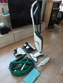 Vendo Aspirapolvere Folletto assieme a battitappeto, lavapavimenti, picchio per pulire materassi, aspirapolvere per macchina, tubi flessibili con bocchette, panni e sacchi ricambi. La macchina presenta graffi di usura, ma è perfettamente funzionante e in buono stato.