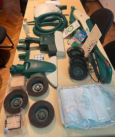 Comprensiva di lucidatrice con completo di spazzole per lucidare, scopa per tappeti, moquette e materassi, tubo per aspirare, sacchetti accessori.