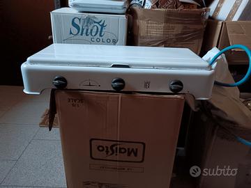 Fornellino a gas a tre fuochi perfettamente funzionante compreso di riduttore per la bombola e tagliafiamma di ricambio
