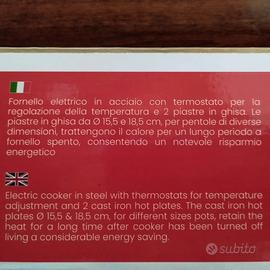 Fornello elettrico in acciaio con termostato per la regolazione della temperatura e due piastre in ghisa per pentole di diverse dimensioni che trattengono il calore per un lungo periodo a fornello spento, consentendo un notevole risparmio energetico. Colore nero. Potenza 1500 W