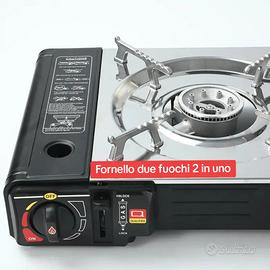 Fornello a gas a 2 fuochi, caratterizzato dal sistema Dual Fuel (2 in 1). La sua particolarità è la flessibilità totale: può essere alimentato sia dalle classiche bombolette di butano a incastro, sia dalla bombola GPL standard grazie all'attacco dedicato.