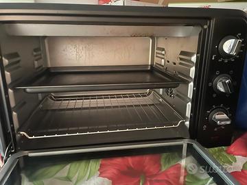 Fornetto elettrico Moulinex in ottime condizioni, termostato fino a 240º, 6 modalità tra cui grill e ventilato, capienza 33 l, dimensioni 53x33x37, 1600W, peso meno di 7 kg.