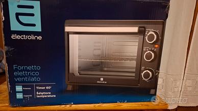 vendesi fornetto elettrico ventilato potenza 1200W capacità 19 litri, timer 60 minuti compreso di accessori inclusi: griglia in acciaio e vassoio in alluminio, temperatura massimo 230°. Garanzia 2 anni. Il fornetto è stato acquistato a giugno 2025, fino ad oggi ha solo 8 mesi. Vendo a 50€.