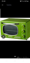 Fornetto elettrico vintage ha una potenza di 1300 watt con quattro livelli di cottura,con termostato 100/230 gradi e timer 60 minuti.Lo sportello è doppio spessore,le misure sono:44cm×28cm×30cm.Esso è molto comodo perché quando non si vuole accendere il forno grande si può utilizzare questo;può bruschettare il pane che non è fresco,cuocere pizze e altre cose.Il fornetto è di un colore vivace verde pistacchio.