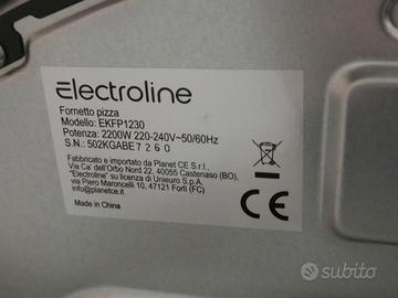 Vendo fornetto per pizza Electroline EKFP1230 causa inutilizzo. Potenza: 2200 W. Temperatura: Da 80ºC a 430°C. Capacità: Pizze fino a 30 cm. Programmi automatici: Il forno dispone di 7 modalità automatiche preimpostate per facilitare la cottura. Modalità DIY (Do It Yourself): È presente una modalità manuale che permette di personalizzare temperatura e tempo di cottura. Accessori: Pala in alluminio. Il fornetto è stato usato una sola volta di conseguenza la pietra refrattaria presenta alcune macchie.