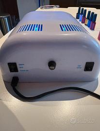 Kit per smalto semi permanente usato 2 volte. Vendo per inutilizzo 1 fornetto (funzionante, come in foto, attaccabile ad una presa) Kit di 9 lime per semipermanente 6 smalti nuovi per semipermanente (1 top coat, 5 colori) - tubetti pieni 3 smalti usati in REGALO (1 base coat, 2 colori) - tubetti non pieni