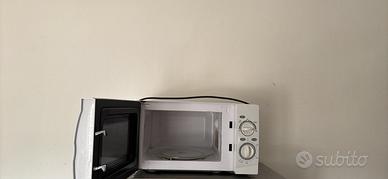 Vendo forno a microonde da appoggio di colore bianco, con apertura laterale, piatto girevole in vetro e doppia manopola frontale per potenza e timer. L’elettrodomestico è usato e presenta alcuni normali segni estetici dovuti all’utilizzo, visibili nelle foto. Ideale per scaldare cibi, bevande e pasti in modo semplice e veloce. Vendita con formula visto e piaciuto.