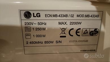 Vendo forno a microonde LG con funzione scongelamento, cottura, grill e riscaldamento cibi. Da 170 W a 850 W. Dotato di piatto per cuocere e griglia per riscaldare 2 piatti in una sola volta. Misure: