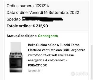 VENDO forno beko Beko Cucina a Gas 4 Fuochi FornoElettrico Ventilato con Grill Larghezza × Profondità 60x60 cm Classe energetica A colore Inox come nuovo , per cambio cucina acquistato al prezzo di 312 euro come ordine allegato ,possibilità ’ di visionarlo a bitonto, e disponibile da maggio perche’ aspetto la cucina nuova prezzo euro 150 trattabile di poco