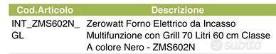 pari al nuovo, in garanzia fino a novembre; usato 1 volta; pulito come un giglio. lo cambio perche pochi mesi dopo ho cambiato lintera cucina. pagato 150€ ZEROWATT ZMS 602 N - ZMS602N Forno da incasso Multifunzione Statico 60 cm - Nero - Classe A - 70 Litri ZEROWATT ZMS 602 N - ZMS602N Forno da incasso Multifunzione Statico 60 cm , Capacità: 70 litri , Potenza: 2100 W , Colore: Nero , Classe energetica: A , Tipo di controllo: Manopola , Numero funzioni: 4 , Larghezza: 595 mm , Altezza: 595 mm , Profondità: 568 mm , EAN: 8059019040165 non spedisco