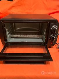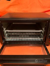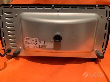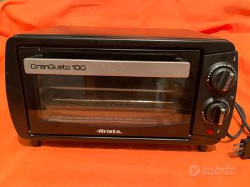 Questo è il fornetto elettrico Ariete GranGusto 100 (Modello 0980/00). Capacità e Potenza: Ha una capacità di 10 litri e una potenza di 800 W. Funzionalità: È dotato di un timer regolabile fino a 60 minuti e può raggiungere una temperatura massima di 230°C. Accessori: Include una griglia in acciaio inox, una leccarda e una maniglia per l'estrazione degli accessori. Caratteristiche: Dispone di porta a doppio vetro per garantire la tenuta del calore. Come nuovo
