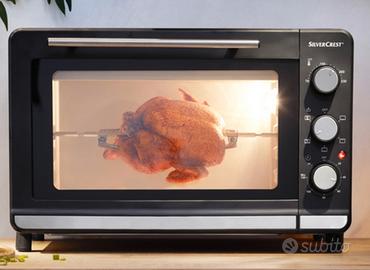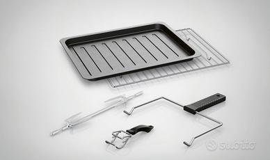 - inclusa griglia, teglia con rivestimento antiaderente, 2 pinze e spiedo girevole con ganci per alimenti