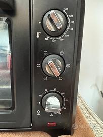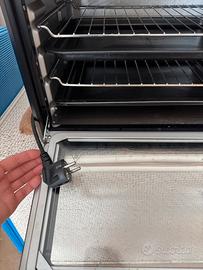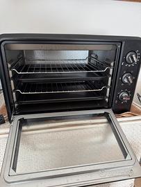 Forno elettrico Moulinex con 4 ripiani interni (include due griglie e due teglie) Tre manopole per regolare temperatura, programma di cottura e tempo. Non gli manca nulla rispetto a un forno da incasso e le dimensioni ridotte lo rendono perfetto per cucine con poco spazio: 52x32x34 (compresa la maniglia)