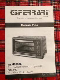 Vendo forno elettrico ventilato con girarrosto G3 FERRARI mod. G10004 Riace 60, usato pochissimo, in condizioni piu che ottime. Dimensioni: Larghezza 69cm Altezza 38cm Profondità 40cm