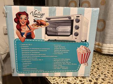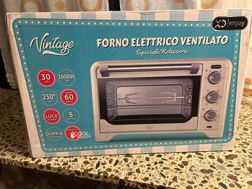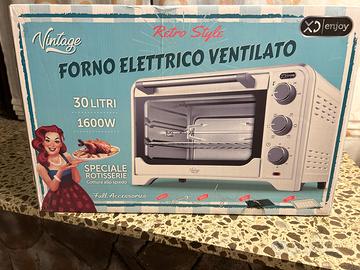 Vendo, perche’ non lo utilizzo, forno elettrico ventilato nuovo stile vintage, come da foto, mai usato e ancora nell’imballo originale, vinto a una lotteria. Le caratteristiche sono potenza 1.600 watt e capacità fino 30 litri max, quindi una buona capacità.Le caratteristiche complete del forno, come dalla foto, sono elencate all’esterno della confezione, più il manuale completo al suo interno, siccome e’ nuovo e non lo ho mai aperto. Potete vedere il suo costo nuovo facilmente in internet, quindi faccio un buon prezzo non trattabile.
