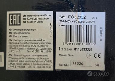 vendo forno elettrico ventilato DeLonghi, modello EO32752 da 32 litri, mai usato causa problemi famigliari.