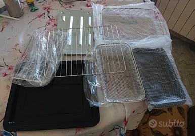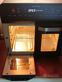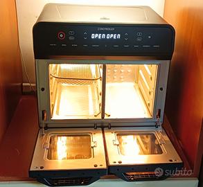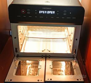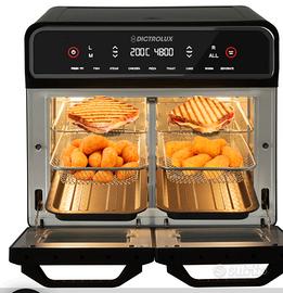Ideale per friggere senza olio carne, pesce, patatine, verdure e molto altro, offre versatilità e comodità in un unico elettrodomestico. Utilizza i due scomparti separatamente per cucinare con programmi differenti o insieme con lo stesso programma. Rimuovendo il divisorio centrale, si trasforma in un capiente forno ad aria da 23 litri. Termostato da 60°a230°