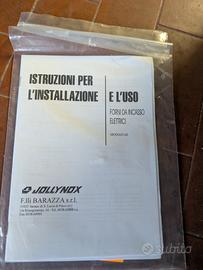 Questo apparecchio è un forno da incasso Jollynox della serie FV-DESIGN. È un modello classico in acciaio o smalto nero, prodotto da Jollynox (un marchio del gruppo italiano Barazza). Componenti Principali e Funzionamento Basandosi sul design standard della linea Jollynox FV-DESIGN, il pannello frontale include: Selettore delle Funzioni (Manopola a destra): Permette di scegliere la modalità di cottura (es. statico, ventilato, grill). Termostato (Manopola a sinistra): Regola la temperatura, solitamente da 50°C a "max" (circa 250°C). Contaminuti (Manopola inferiore): Programmatore meccanico per impostare il tempo di cottura desiderato. Spie Luminose: Spia di funzionamento: Indica che il forno è acceso. Spia del termostato: Si spegne quando il forno ha raggiunto la temperatura impostata.
