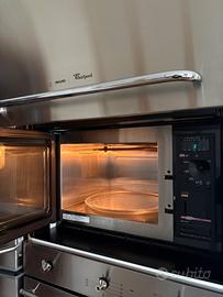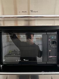 Il forno a microonde Philips Whirlpool, modello AVM 908/NB, è studiato per l'installazione a incasso all'interno di un vano a scomparsa. L'elettrodomestico è alloggiato dietro un'anta a ribalta verso l'alto con finitura in acciaio inox satinato e maniglia tubolare, pensata per integrarsi a filo con i mobili della cucina e nascondere l'apparecchio quando non è in uso. Il corpo del microonde presenta un'estetica nera con un ampio sportello in vetro temperato. Nella fascia destra si sviluppa il pannello di controllo, dotato di un display digitale superiore e di vari pulsanti per la selezione delle funzioni, tra cui le opzioni di cottura rapida, il sistema "Auto Grill" e la tecnologia "Double Emission System" per una distribuzione uniforme delle microonde. La cavità interna, realizzata in acciaio inossidabile per facilitare la manutenzione e garantire durata nel tempo, include il sistema di illuminazione e il piatto rotante in vetro trasparente.