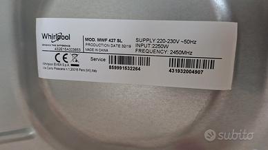 Forno microonde Whirlpool con funzione crisp e cottura a vapore funzionante ma con display difettoso (spesso non si accende o si accende ma è poco visibile). Possibile utilizzo conoscendo le funzioni oppure per prelievo di parti di ricambio. Preferibile consegna a mano, possibile spedizione.