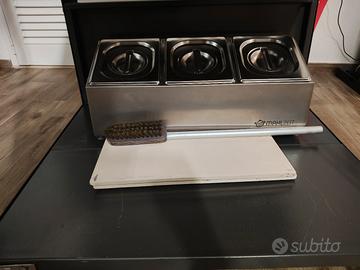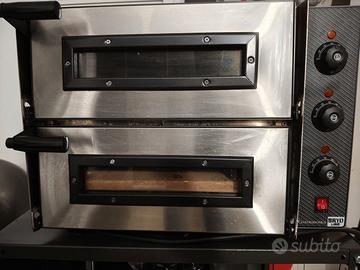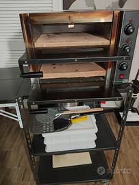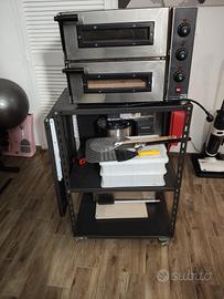 vendo mobile da me creato con anta apribile dove stendere la massa, impastatrice planetaria g3 Ferrari nuova usata due volte con gancio spiarale e foglia, porta ingredienti in acciaio inox, pala pizza 30cm, paletta ruota pizze, spazzola, termometro laser, biscotti 2.5 cm usati due volte e biscotti 1cm usati ma in ottimo stato, 2 cassette porta panetti, paletta spezza panetti in acciaio. il forno è in buono stato della gastrodomus (made in Italy) com doppia camera da 350 gradima con biscotto da 1cm arriva a 400. tre resistenze da 800w l'una con un termometro per ogniuna per un totale di 2400w.