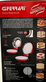 Forno Pizza Plus 3G Ferrari modello G10032 rosso. E’ il modello con 2 pietre refrattarie: si usa la sola pietra inferiore per la cottura della pizza e si usano entrambe le pietre (inferiore e superiore) per cuocere tigelle panini toast piadina e focaccia. L’ho usato una sola volta e c’e’ la confezione originale. Se in zona si puo visionare e provare senza impegno.