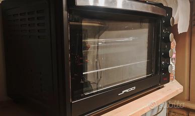 Forno elettrico portatile ventilato marca Jago, 48 litri 2000 W, timer 60 minuti, grill, doppio vetro, temperatura fino a 230 gradi, luce interna, auto spegnimento 1 ora, accessori compresi tra cui spiedo, 2 teglie + 1 griglia.