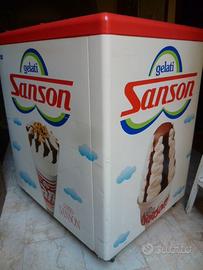 Freezer "Gelati Sanson " del 1995 e funzionante. Misura cm 75x60, alto cm 90. Ottimo anche come arredo bar ed in alternativa come pannelli pubblicitari vintage. Con i normali segni del tempo. Non spedisco, solo ritiro a Verona città.
