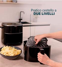 Friggitrice ad aria versatile con 6 programmi preimpostati: Prepara facilmente patatine, dolci, carne e pesce con impostazioni automatiche o personalizza temperatura e tempo tramite il touchscreen LED intuitivo. Ampia capacità di 8L per pasti in famiglia: Cuoci fino a 2 kg di patatine (circa 8 porzioni). Regola l’altezza della griglia inclusa per porzioni più piccole e assicurati una cottura uniforme per ogni pietanza. Risparmio energetico e cottura potente: Consuma meno energia rispetto a un forno, garantendo la stessa croccantezza dorata. Con 1800W di potenza, friggi, arrostisci e cuoci una varietà di piatti in modo rapido ed efficiente. Facile da pulire grazie all'interno antiaderente: La griglia removibile è lavabile in lavastoviglie, mentre il rivestimento interno antiaderente si pulisce con un panno umido. Evita utensili in metallo per preservare la finitura. Design compatto e resistente: Il manico removibile facilita la conservazione.