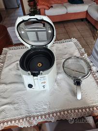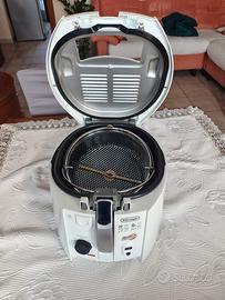 Friggitrice ad olio DeLonghi Roto Fry bianca, con cestello rotante inclinato.