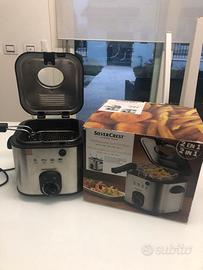 Vendo per inutilizzo friggitrice ad olio con inserti per fonduta. La friggitrice è stata usata solo 2 volte è in ottime condizioni pari al nuovo già pulita e igenizzata, pronta all uso. Caratteristiche: - capacità 1 litro di olio - temperatura massima 190'C selezionabile tramite selettore posto nella parte centrale in modo da scegliere la temperatura desiderata per le varie pietanze ( uova, pesce, pollo, patatine)... -potenza 840W - cestello di frittura in acciaio adatto per lavastoviglie -led che indica se l'olio è arrivato in temperatura o no