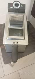 Friggitrice AEG, modello FR 5547. Ha un contenitore per l'olio da circa 3 litri. Funziona con una potenza di 2000 W. Realizzata in acciaio inossidabile (Inox). Dispone di un termostato regolabile tramite una manopola superiore per impostare la temperatura desiderata e due spie luminose ("Power" e "Heating"). Include un coperchio con filtro per grassi e odori e un oblò per monitorare la cottura. USATA UNA VOLTA PER ACCERTARMI DEL SUO FUNZIONAMENTO.