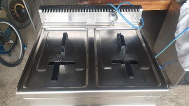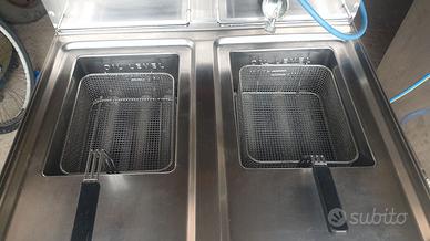 Friggitrice professionale due vasche da 15 litri. Tutta in accio INOX come nuova, perfettamente funzionante, qualsiasi prova. Con ruote piroettanti (vedi foto) e scarico olio in vaschetta o con tubo direttamente allesterno. Trasporto compreso a carico del venditore nel raggio di 100 Km. Con tubo gas scadenza 2030 e relativo regolatore.