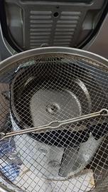 Friggitrice De'Longhi "Friggimeglio Super" (modelli F28311.W1 o F28533.W1). Presenta un esclusivo cestello rotante angolato che riduce il consumo di olio fino al 50%. È dotata del sistema brevettato "Easy Clean System" per un facile scarico dell'olio. La capacità è di circa 1,2 litri di olio e 1 kg di cibo. Include un termostato regolabile per impostare la temperatura tra 150 e 190°C. La potenza è di 1800 W e la vasca è antiaderente. Ha un vano per il cavo e la cottura è ispezionabile. Perfettamente funzionante.