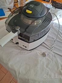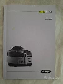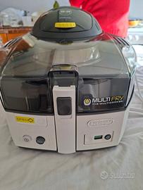 Friggitrice ad aria/multicooker De'Longhi MultiFry classic modello FH1163/1 nuova, mai usata. Si tratta di un elettrodomestico versatile che combina le funzioni di friggitrice a basso contenuto di olio e multicooker, permettendo di preparare una varietà di ricette con poco o zero olio, dal risotto alle patatine fritte, torte e stufati. Frigge, cuoce, sforna e griglia, utilizzando un sistema di riscaldamento combinato superiore ventilato e inferiore (200 W). Voltaggio: 220-230V ~ 50/60Hz. Potenza totale dell'unità 1550W. Include una pala mescolatrice per mescolare automaticamente gli ingredienti durante la cottura. Parti estraibili e lavabili in lavastoviglie. Completa di dosatore, manuale d'uso e ricettario. Prezzo occasione, valore medio 200 €.