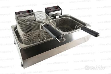 Friggitrice elettrica professionale. Struttura in acciaio inox per alimenti, doppia vasca estraibile, termostato ad alta precisione, secondo termostato che fornisce sicurezza del calore. Regolazione e accensione indipendente delle vasche. Cell: 3202314412 Specifiche tecniche: Potenza: 6kW Capacità: 8+8 lt Dimensioni: 67x65x34 cm