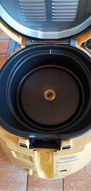 Friggitrice a olio con vasca antiaderente estraibile e lavabile in lavastoviglie, inclinata per cuocere con metà olio, e cestello rotante. Usata pochissimo, priva di danni esterni e interni.
