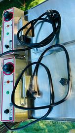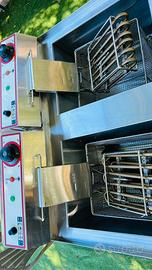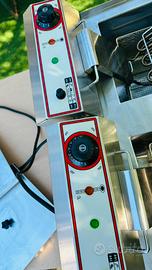 Friggitrice elettrica DUE vasche 9+9 litri SW cm 63*48*35h accensione indipendente delle vasche , rubinetti di scarico dell'olio, spia indicazione temperatura, spia accen-sione, testate ribaltabili e asportabili, con micro interruttore di sicurezza, interamente in acciaio inox.Gocciolatoio perimetrale di protezione, termostati di sicurezza anti incendio.