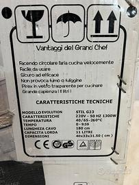Sistema di cottura ad arua STILTEX, 11L con contenitore in vetro temperato da 30cm. Display touch screen, vaschetta superiore che funge da vapirizzatore per inumidire i cibi. Completa di accessori spiedo e griglie. Vendo per inutilizzo, usata poche volte. Pagata 500€.
