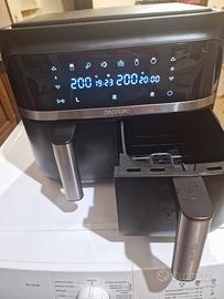Cecotec Cecofry Dual Capacità:9 litri totali, divisibile in due cestelli indipendenti da 4,5 litri ciascuno. Potenza:2850 W. Caratteristiche:Pannello touch multifunzione ione con 6 modalità preimpostate. Tecnologia:PerfectCook per una circolazione dell'aria calda ottimale.