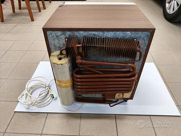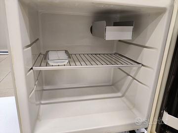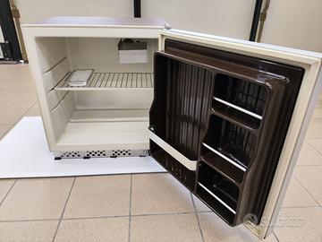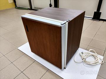 Piccolo frigo minibar, funzionante ed in ottime condizioni. Ideale per essere incassato o posto sotto il piano di un mobile. Porta rivestita esternamente in legno per essere più gradevole e inseribile in un ambiente domestico.