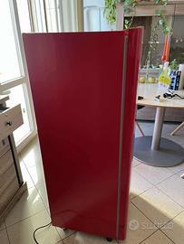 Frigorifero rosso di dimensioni compatte, ideale per piccoli appartamenti, uffici o come secondo frigo. Dispone di un piccolo freezer integrato nella parte superiore, perfetto per ghiaccio o surgelati di piccole dimensioni.