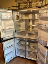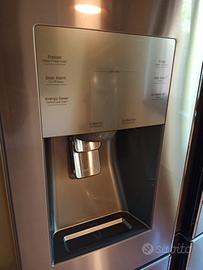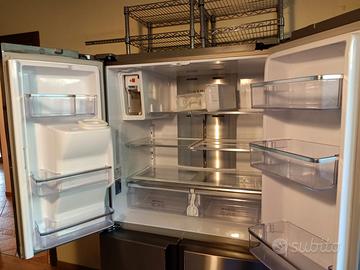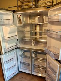 Per trasloco vendo frigorifero americano usato perfettamente funzionante, marca Samsung side by side modello RF56J9041SR, Serie 9000 inox spazzolato con 4 porte libera istallazione, Classe A++. Dotato di distributore acqua fresca e ghiaccio tritato o in cubetti, Sistema Triple Cooling con gestione indipendente della temperatura per controllo ottimale umidità e odori, Cool Select Zone+ con compartimento inferiore destro che può essere convertito da frigorifero a congelatore utilizzando quattro impostazioni di temperatura. Larghezza (mm): 908, altezza netta scocca con cerniera (mm) 1825, altezza netta scocca senza cerniera (mm): 1797, profondità netta con maniglia porta (mm): 733, profondità senza porte (mm): 610
