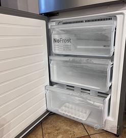 Frigorifero combinato BOSCH a libera installazione, Total NoFrost, composto da frigorifero nella parte superiore (con balconcini + portabottiglie + ripiani in vetro riposizionabili + cassetto frutta + cassetto carne/pesce) e congelatore nella parte inferiore (3 cassetti trasparenti), a due ante reversibili, finitura ante in alluminio colore antracite traslucido, apertura con gola, possibilità di posizionarlo a filo muro avendo cerniere dedicate allo scopo, misure in cm. L 59,5 P 63,5 H 202.