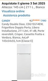 vendo frigorifero candy acquistato 6 mesi fa, prezzo pagato 245 euro. il frigo ha graffi visibili su ogni lato come da foto. scontrino x garanzia. misure 143 x 54 x 54