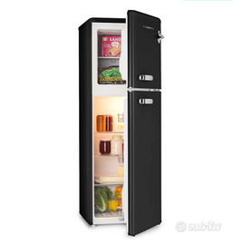 Frigorifero combinato con congelatore mod. Audrey colore nero. Capacità 97 litri + 39 litri. Impugnature cromate e apribottiglie. Due ripiani di vetro infrangibile, uno scomparto per le verdure rimovibile e tre vani sullo sportello per bottiglie, barattoli e lattine. Cambio per acquisto frigo a due ante.