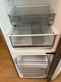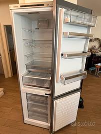 Vendo splendido frigorifero combinato Siemens iQ500 in finitura acciaio inossidabile anti-impronta, perfettamente funzionante e in condizioni estetiche eccellenti. Il frigorifero è un top di gamma, molto silenzioso e con un’efficienza energetica altissima (Classe A+++). Caratteristiche principali: Tecnologia hyperFresh: Due cassetti speciali con controllo dell'umidità e temperatura (0°C) per mantenere carne, pesce, frutta e verdura freschi fino a 3 volte più a lungo. Ripiani EasyAccess: Ripiani in vetro estensibili per caricare e scaricare comodamente i prodotti. PowerVentilation: Sistema di ventilazione interna per una distribuzione uniforme del freddo. Congelatore BigBox: Ampio cassetto nel freezer per conservare alimenti di grandi dimensioni. Design Premium: Illuminazione interna a LED, finiture in metallo e display elettronico sulla porta per il controllo separato delle temperature. Filtro AirFresh: Elimina gli odori sgradevoli all'interno. Dimensioni standard: Altezza circa 201 cm Larghezza 60 cm. Il frigo è stato pulito e igienizzato con cura, pronto all'uso. Gli interni (ripiani, balconcini porta e cassetti) sono integri